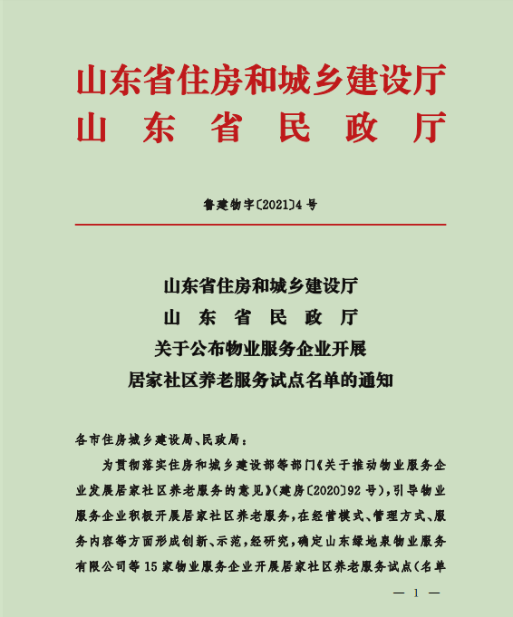 2021年9月6日,山東省住房和城鄉(xiāng)建設廳、山東省民政廳聯(lián)合公布了關于物業(yè)服務企業(yè)開展居家社區(qū)養(yǎng)老服務試點名單,我公司在首批試點名單之列。  ......