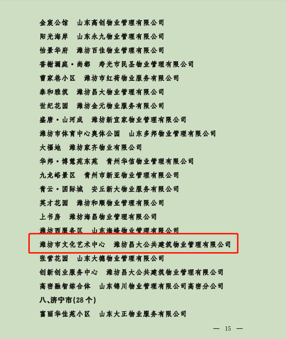 9月3日,山東省住房和城鄉建設廳公布關于品牌建設典型示范案例和“質量標桿”項目(第二批)名單,我公司作為品牌建設典型示范案例予以公布、服務管理的濰坊市文化藝術中心和峽山區創新創業服務中心同時獲得質量標桿項目。